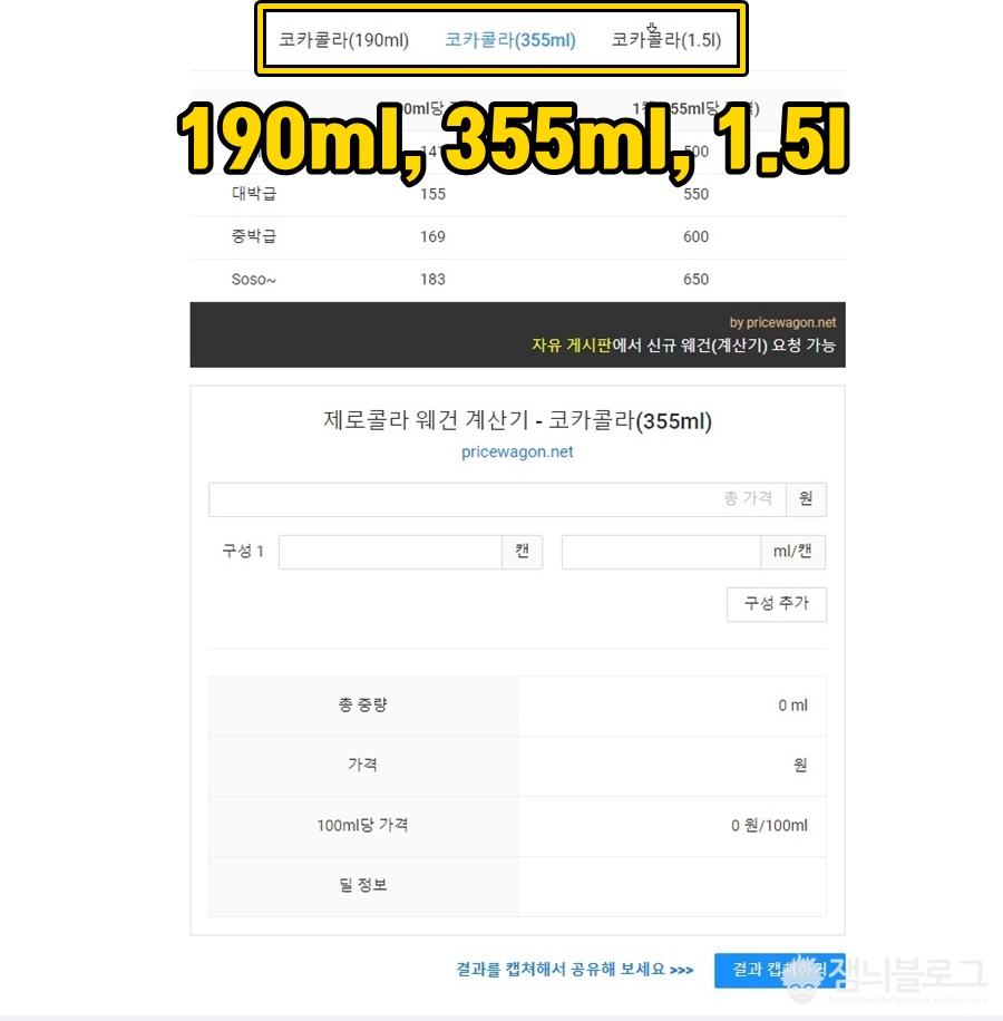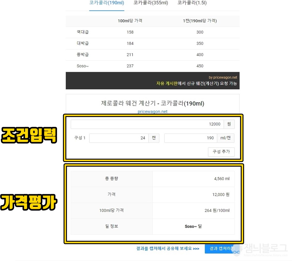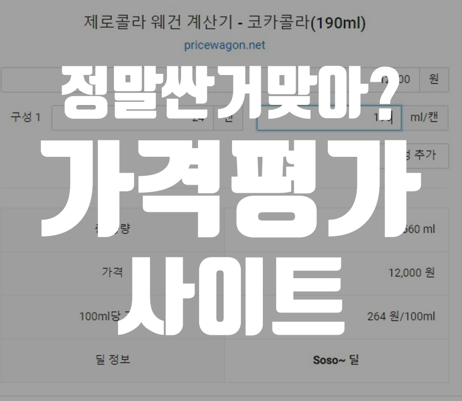 저는 콜라웨건을 진행해봤습니다. 콜라 일반캔, 뚱캔, 페트로 나눠서 가격을 평가할 수 있습니다. 내가 구매하고자 하는 딜의 조건을 입력하면 아래에 가격평가가 나옵니다. 가격은 역대급, 대박급, 중박급, 소소로 나뉩니다. 급하면 중박급과 소소에서 구매해도 되지만 그게 아니라면 대박급을 기다리는 게 좋습니다. 역대급은 자주 뜨지 않아서 대박급에서 타협을 보는 게 낫습니다.