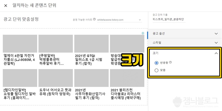 [크기]는 반응형과 맞춤이 있는데 반응형으로 하는 게 좋습니다. 이것도 따로 건들 건 없습니다.