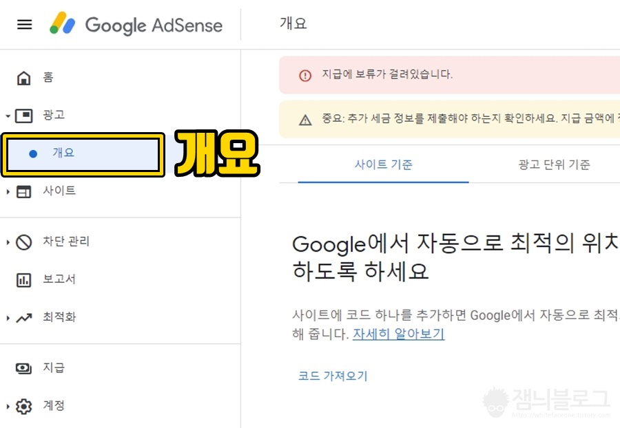 애드센스에서 좌측에 있는 [개요]를 클릭합니다.