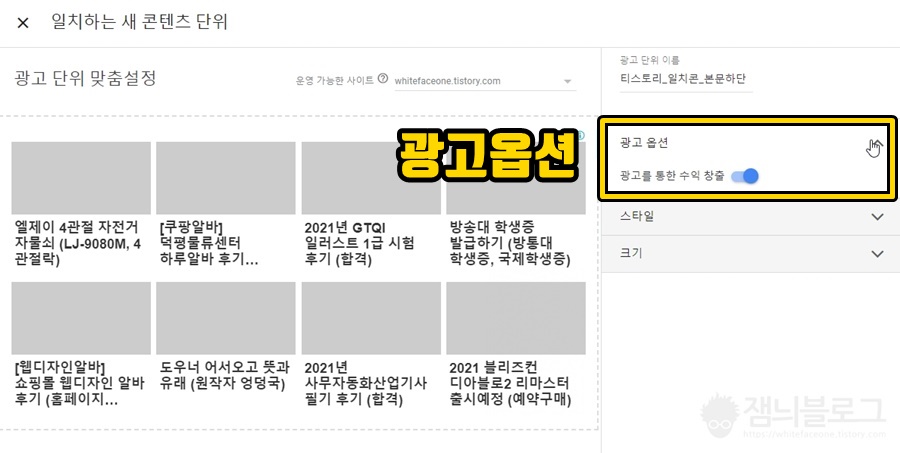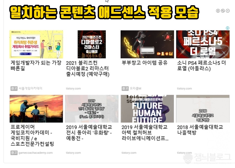 어떤 블로그에 들어갔다가 하단광고가 단일광고가 아니라 포스팅과 함께 8개가 뜨는 것을 보았습니다. 뭔가 알아보니 애드센스의 '일치하는 콘텐츠'였습니다. 일치하는 콘텐츠 관고 단위를 만들어서 기존에 하던대로 코드를 복붙하던가 slot을 이용하여 광고를 달 수 있습니다.