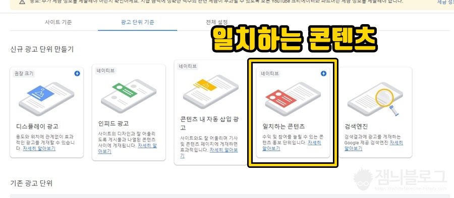 광고 단위 기준에서 [일치하는 콘텐츠]를 클릭합니다.