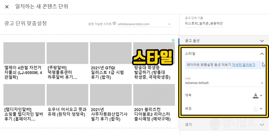 [스타일]은 왼쪽에 뜨는 프리뷰를 보면서 폰트나 제목, 배경을 수정할 수 있습니다. 딱히 수정할 필요는 없습니다.