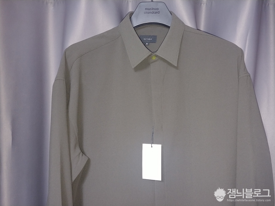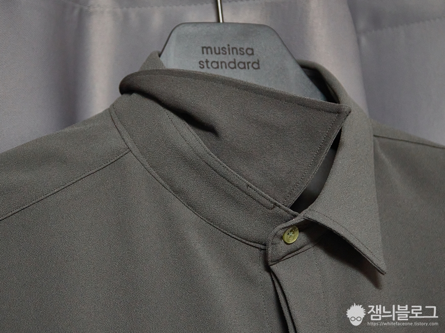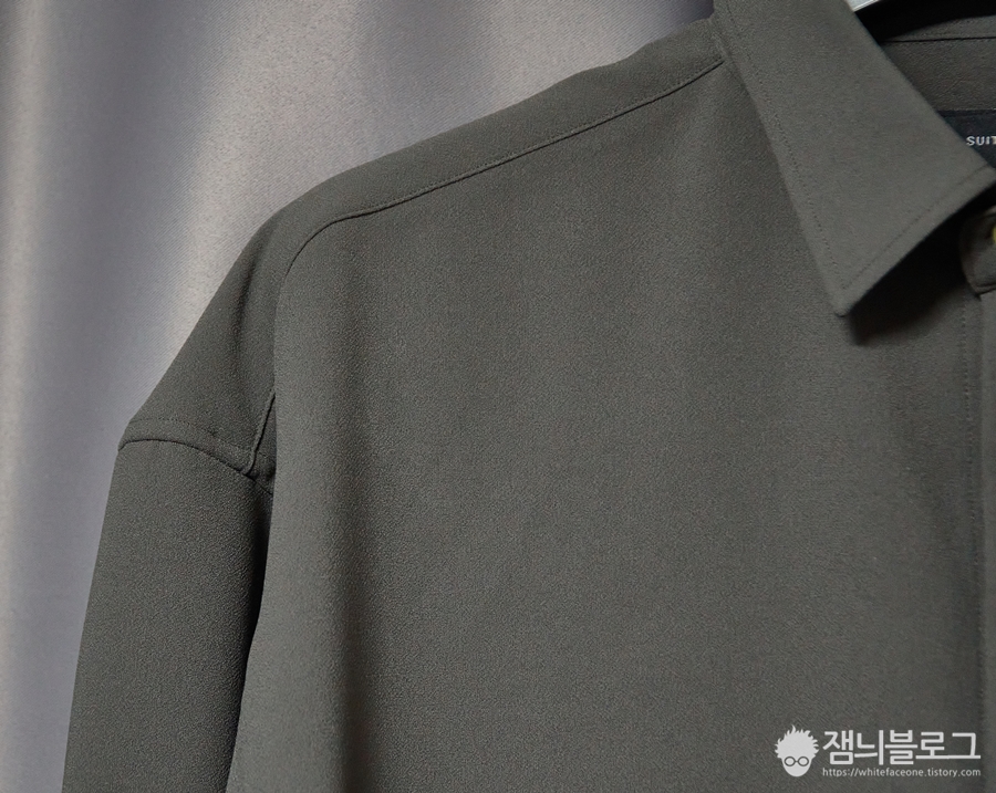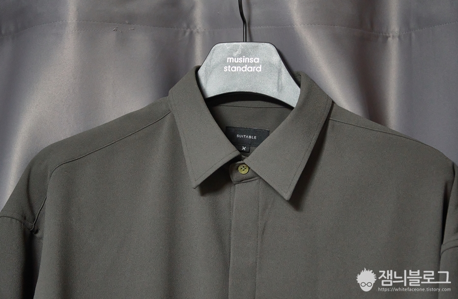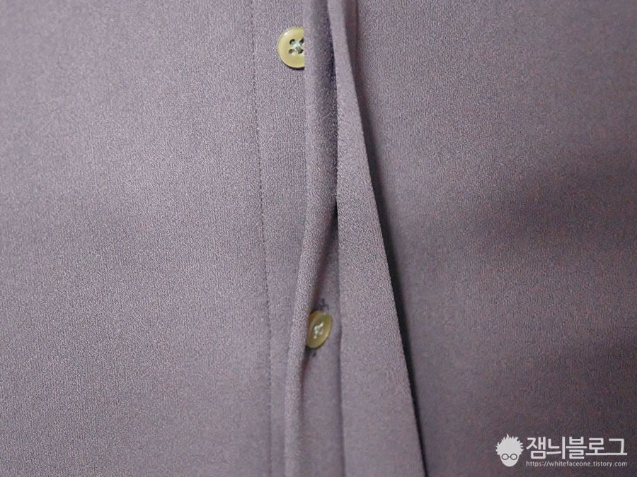 단추는 맨 위에 있는 단추 빼고는 다 히든이라서 입었을 때 보이지 않습니다. 굉장히 깔끔한 느낌을 줄 수 있습니다.