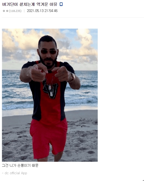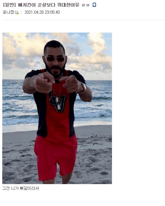 축구선수 '카림 벤제마'가 정면을 보면서 화면 밖의 나를 가리키는 듯한 짤방과 함께 사용되면서 흥하게 됩니다. 사실 손가락으로 가리키는 게 아니라 구부리고 있어서 삿대질이 아니지만 분위기상 삿대질을 하는 것처럼 느껴집니다. 반대로 이미지를 수정하여 벤제마가 스스로를 가리키게 하여 '그건내가'로 바꿔서 쓰기도 합니다.