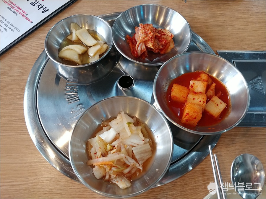 기본 테이블 세팅입니다. 양파장아찌, 배추김치, 깍두기, 흰김치입니다. 입안을 개운하게 해주는 반찬으로 구성되어 있습니다.