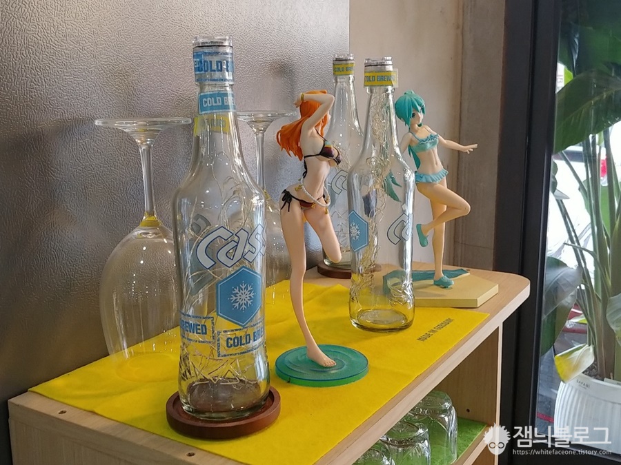 같이간 회사 사람이 알려줘서 보니 피규어가 있습니다. 만화 원피스 캐릭터로 보입니다. 맥주병도 있고 장식을 해놨습니다.