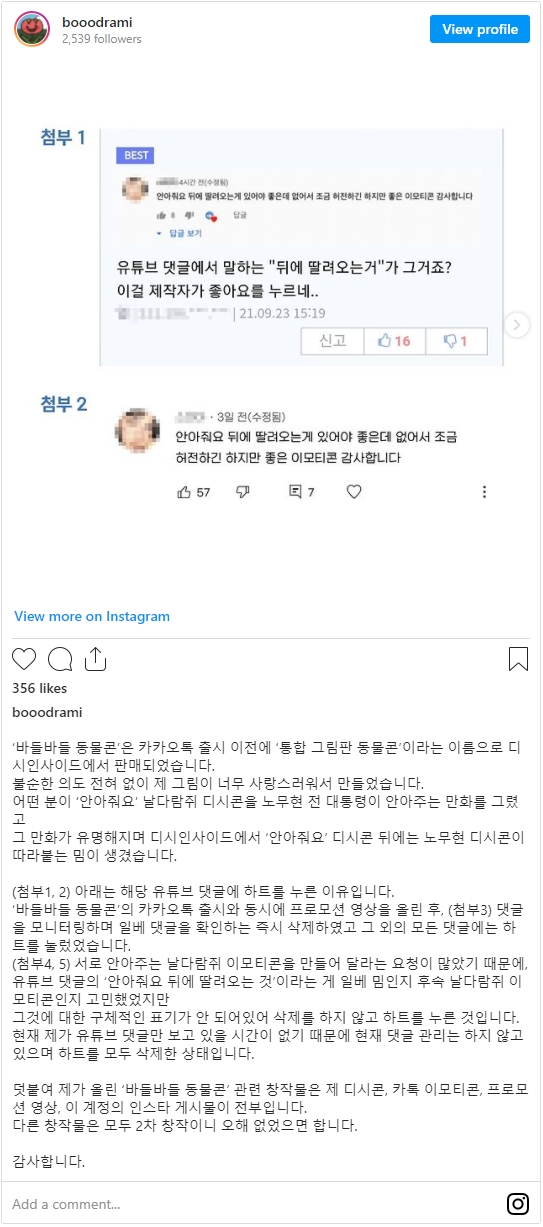 2021년 9월 23일 카카오톡에 '바들바들 동물콘'이 등록되면서 이를 홍보하기 위한 공식 유튜브 채널도 생겼습니다. 해당 채널에는 동물콘 영상이 업로드 되었는데 댓글에 노무현 전대통령을 은유하는 댓글에 제작자가 하트를 누르면서 논란이 생겼습니다. 이에 사람들은 대댓글로 문제를 지적하였고 제작자는 인스타그램을 통해 해당 댓글의 맥락을 파악하기 어려워 생긴일이라고 해명했습니다. 제작자는 문제가 되는 댓글의 하트를 취소했고 공식 영상의 댓글사용을 중단했습니다.