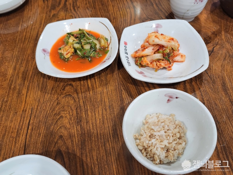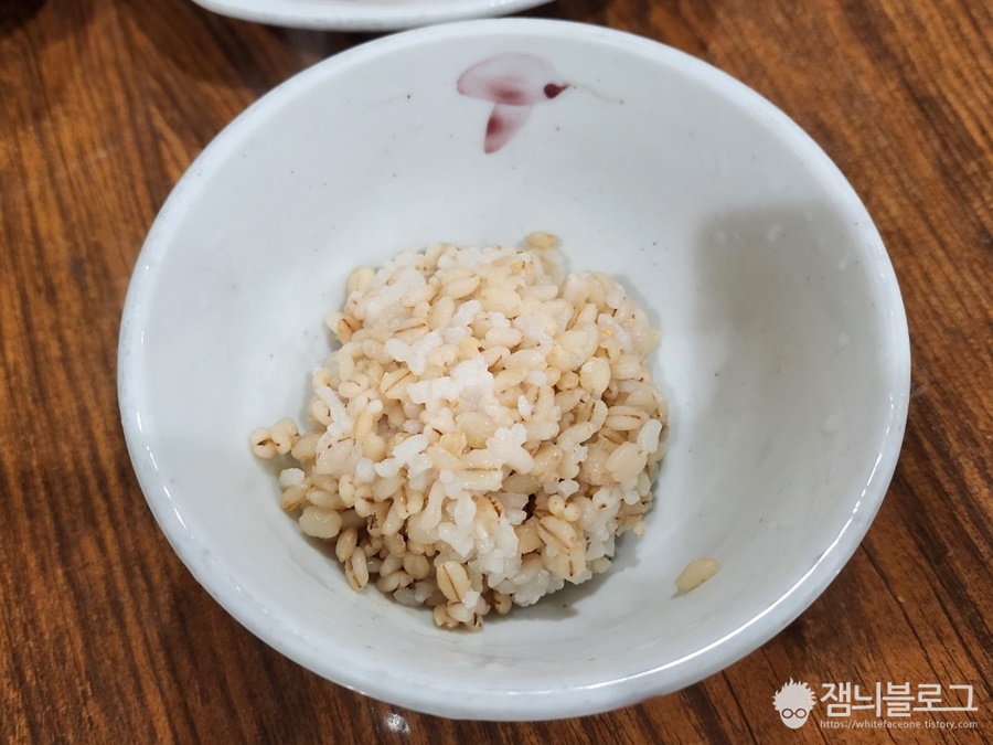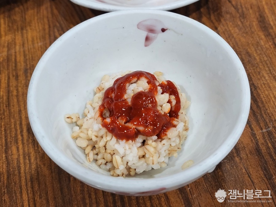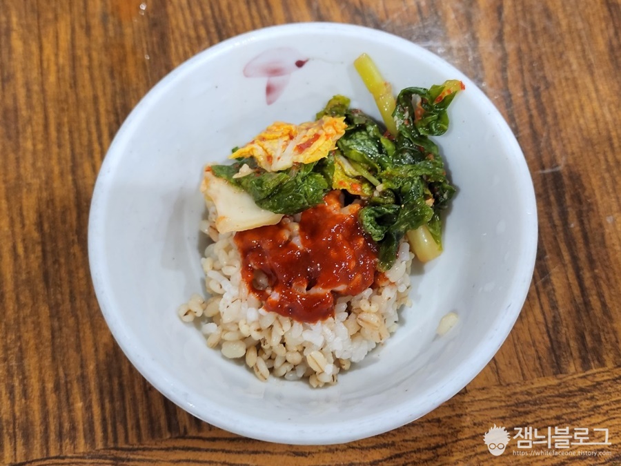김치를 세팅하니 보리밥이 나왔습니다. 칼국수가 나오기 전에 에피타이저 느낌으로 보리밥을 김치에 먹으면 됩니다.