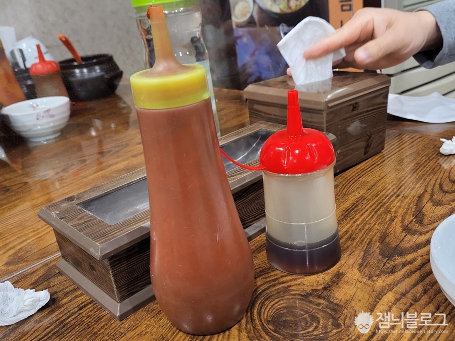 테이블에는 수저통, 냅킨, 고추장, 참기름이 있습니다.