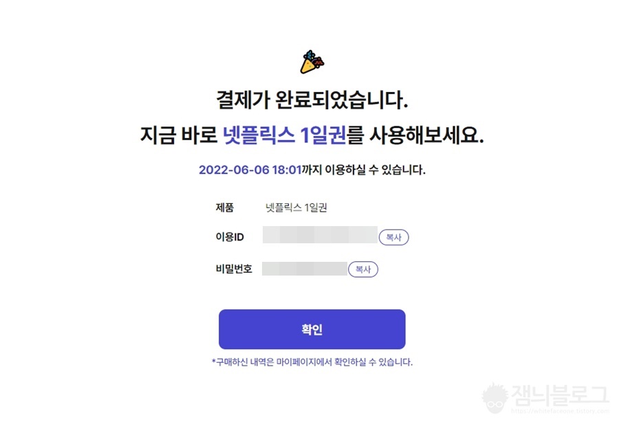 결제 완료 화면입니다. 제공된 ID와 PW를 이용하여 정해진 시간동안 이용할 수 있습니다.