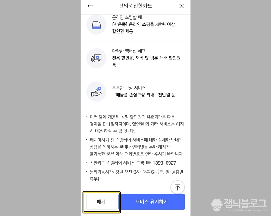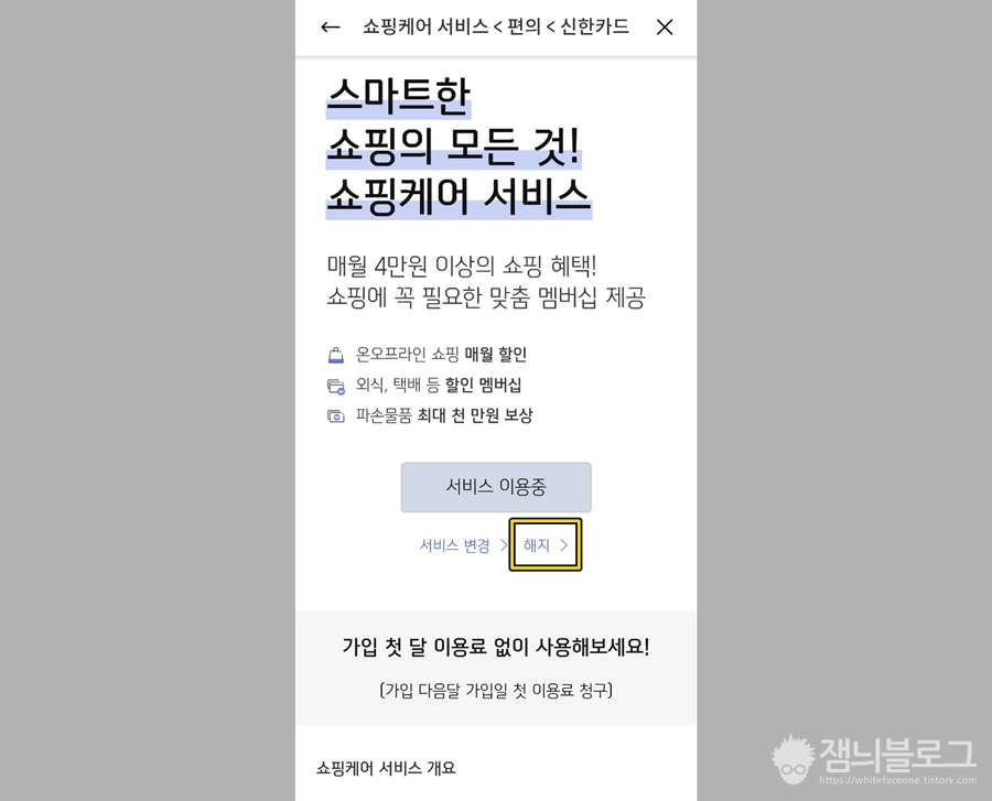 쇼핑케어 안내 페이지에서 [해지]를 클릭합니다.