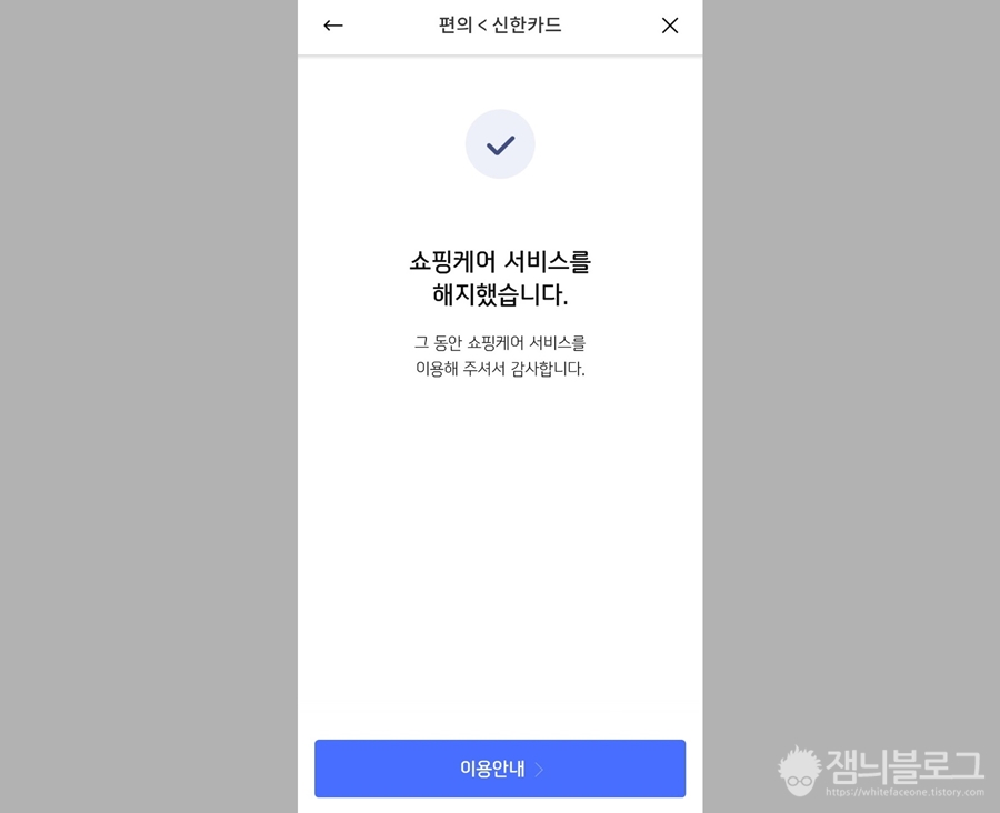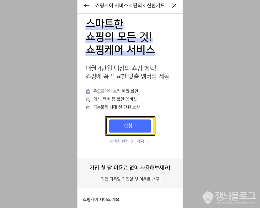 다시 쇼핑케어 페이지로 넘어가면 해지가 완료되어 처음의 [서비스 이용중]에서 [신청]으로 버튼이 바뀐 것을 확인할 수 있습니다.