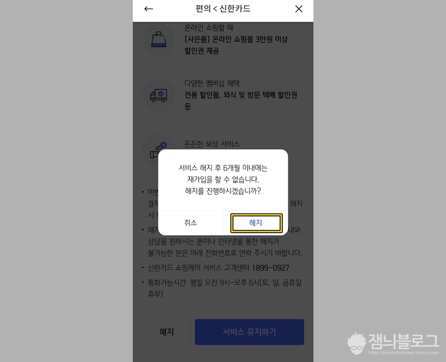 팝업창에서 [해지]를 클릭합니다. (*서비스 해지 후 6개월 이내 재가입 불가능)