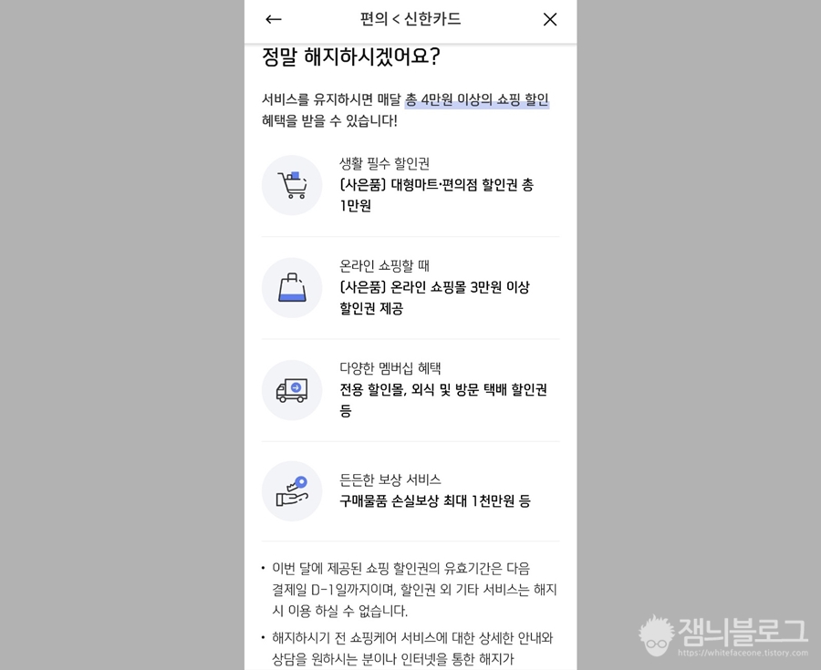 신한카드 쇼핑케어는 매월 8,900원에 온·오프라인 쇼핑관련 할인 서비스를 제공하는 구독형 멤버십 서비스입니다. 이용해보니 8,900원 이상의 효과를 볼 수는 있지만 1인가구인 만큼 마트같은 곳에서 소비가 많지 않아서 굳이 서비스를 가입하거나 유지할 필요는 없다고 판단했습니다.