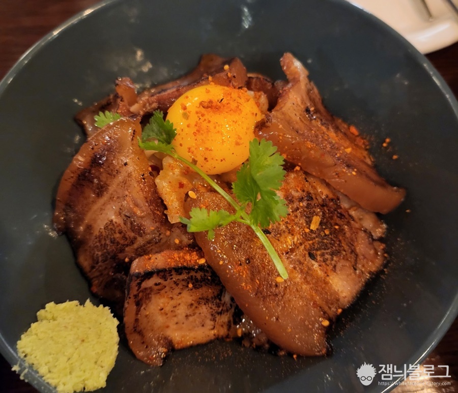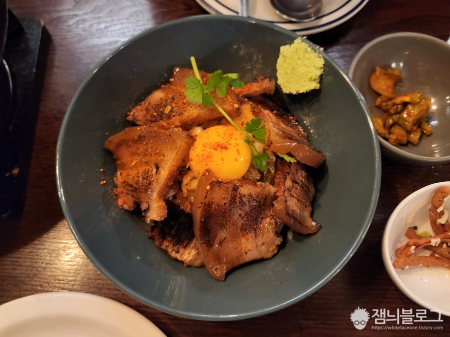 차슈덮밥은 살짝 그을려서 불맛이 있고 플레이팅이 인상적입니다. 고기도 두툼하고 밥도 양념이 되어 있습니다.