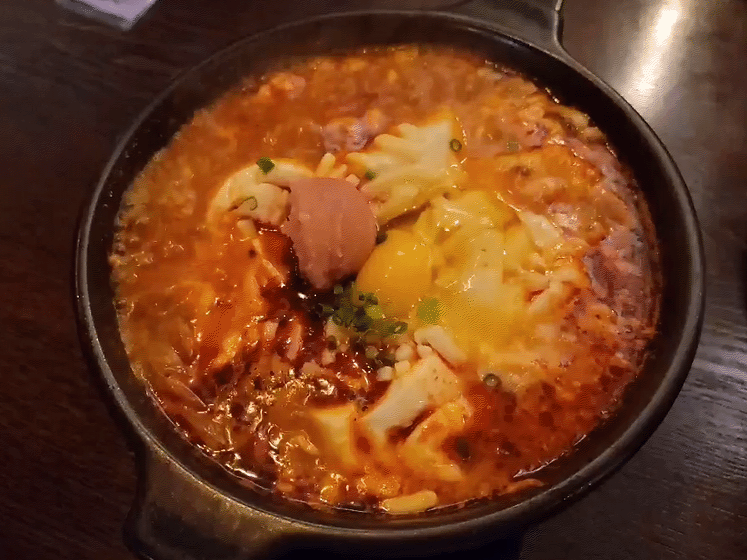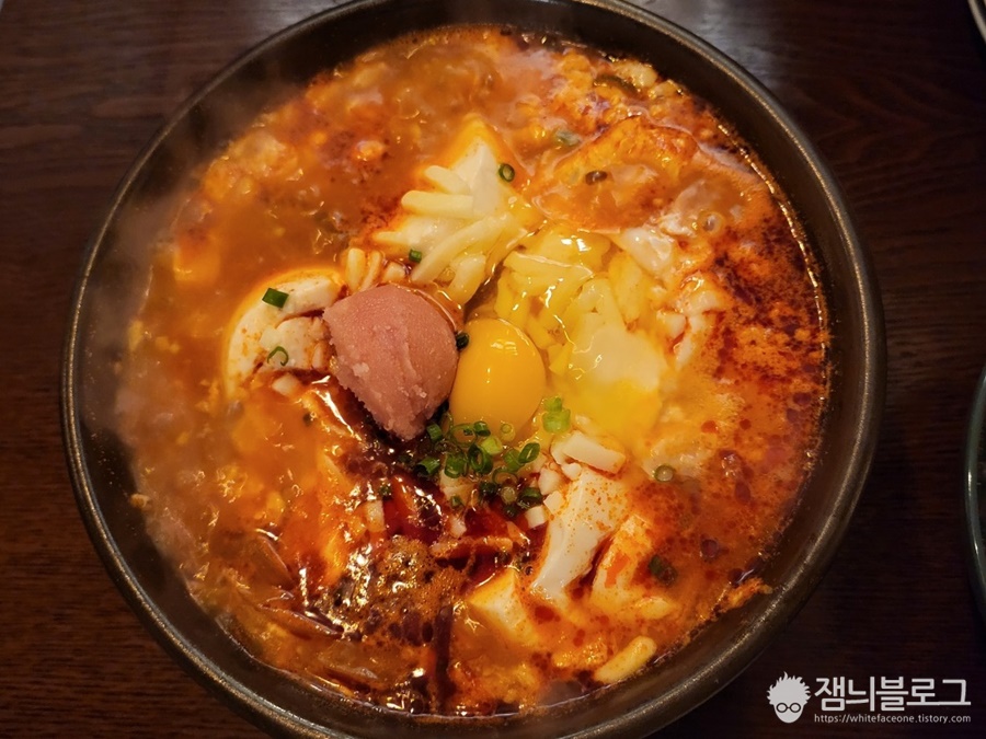 순두부는 계속 따뜻하게 먹을 수 있도록 밑에 고체연료같은데 불을 붙여줍니다. 비주얼이 확실히 이런저런 재료가 들어가서 독특합니다. 치즈가 들어있어서 고소하고 명란이 짭쪼름합니다. 맵지 않고 적당히 고소한 맛입니다.