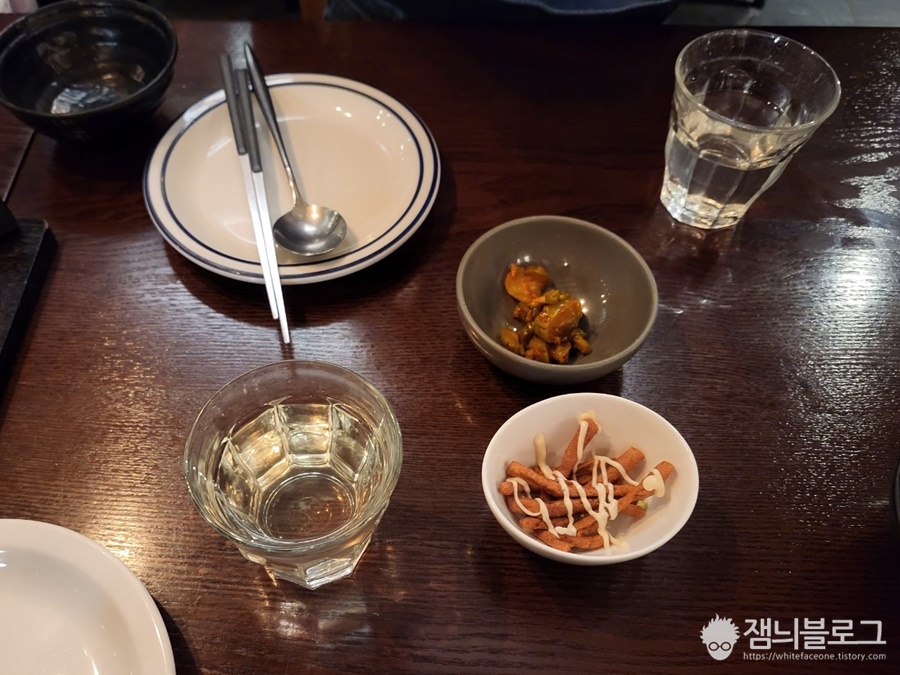 주문을 하고 나면 테이블 기본세팅이 됩니다. 오이지 무침과 무슨 마요네즈 뿌린 튀긴 과자(?)가 있습니다.