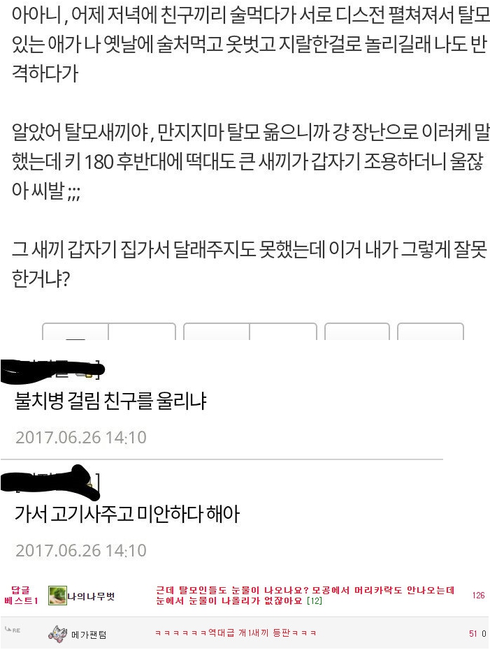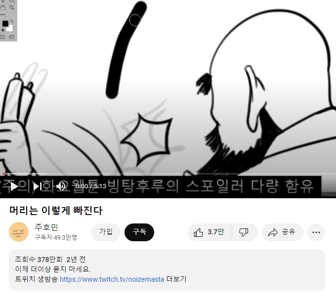 웹툰작가 주호민은 대표적인 탈모인으로 유명합니다. 그림 콘텐츠로 유튜브 채널을 운영하고 있는데, 한번은 너무 탈모관련 문의가 많이 오다보니 머리가 빠지는 과정에 대해서 그림으로 설명하는 방송을 진행했습니다. 실경험자가 그림을 통해 알기쉽도록 사람들에게 알려주는 내용의 영상인데, 일부 사람들이 탈모로 관련 드립으로 댓글을 달기도 했습니다. '타코야끼', '칸쵸', '츄파춥스' 등이 있습니다. 그 중에 '너어는.. 진짜..'도 있습니다.