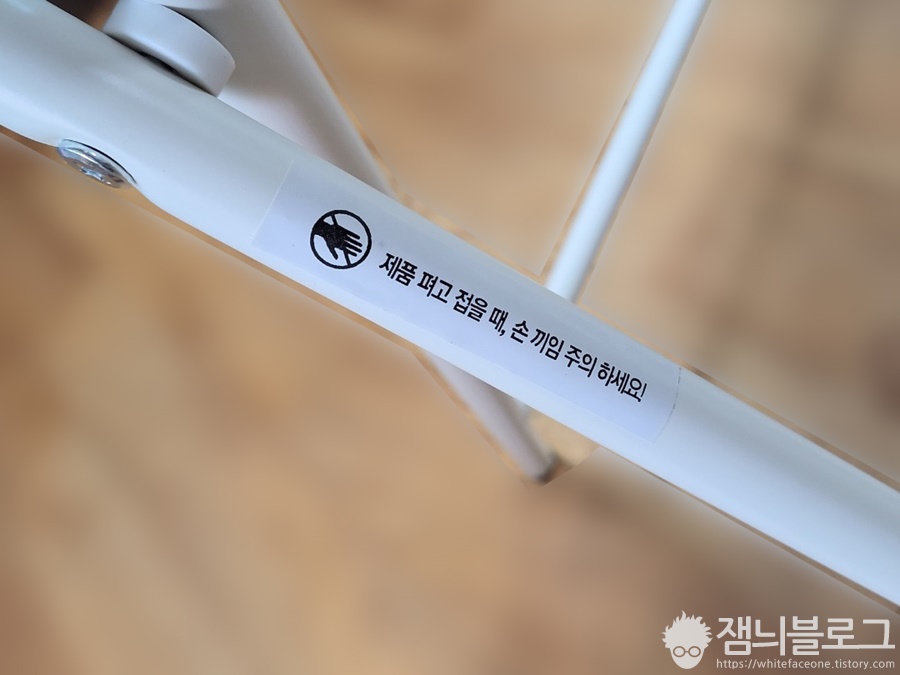 다리에는 경고스티커가 붙어있습니다. 제조사에는 스티커 제거를 권장하지 않는다고 합니다. 딱히 눈에 거슬리진 않으니 그냥 놔뒀습니다.