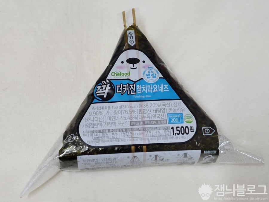 THE 꽉 더커진참치마요네즈 삼각김밥입니다. 가격은 1,500원입니다. 지금보니깐 디자인이 북금곰인가봅니다. 상단에 눈코입이 달려있습니다.