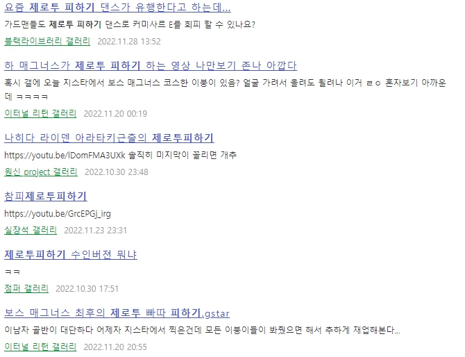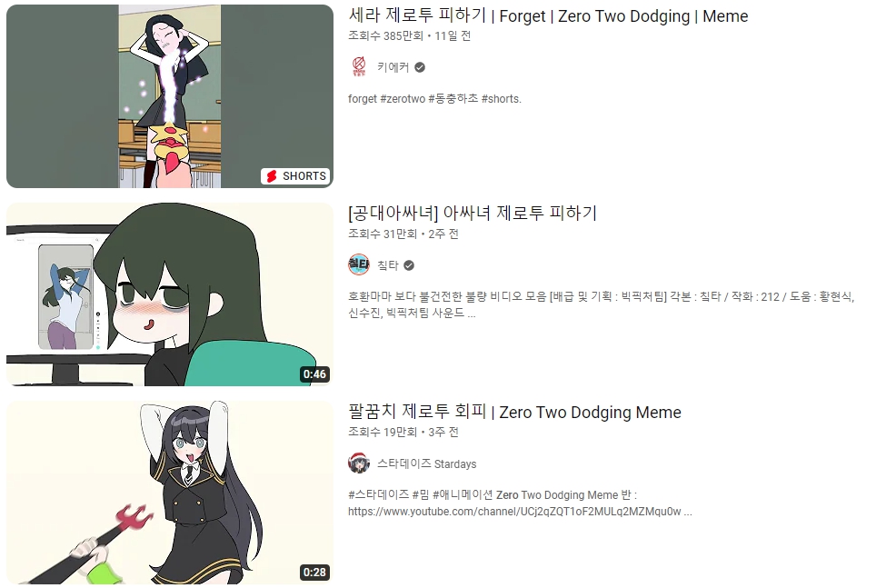 2022년 11월 19일 유튜버 소맥거핀가 제로투 피하기 밈을 패러디 하여 업로드한 영상입니다. 원본의 형식에 따라 제로투 댄스를 이용하여 여러 공격을 회피하는 내용으로 구성되어 있습니다. 직접 따라하기도 하고 이런식으로 애니메이션으로 제작되는 등 다양한 패러디가 진행되고 있습니다.