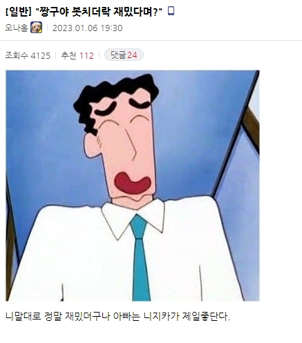 신형만 : "짱구야, 꼭서 참고 다 봤는데도 재미없잖아. 아빠를 속인거니?" 짱구 : "재밌으니깐 다 본거 아니에요?"