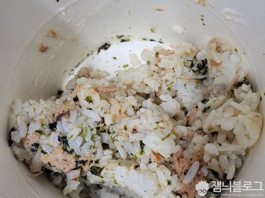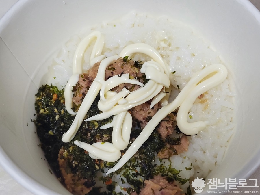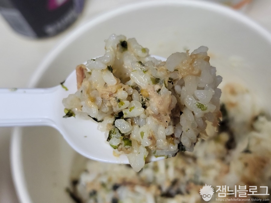 그대로 비벼주면 됩니다. 비주얼이 썩 먹고 싶은 모양은 아니지만 맛 자체는 호불호가 거의 없는 참치마요라서 정말 괜찮습니다. 자취생이 대충 한 끼 때우기 정말 좋습니다.