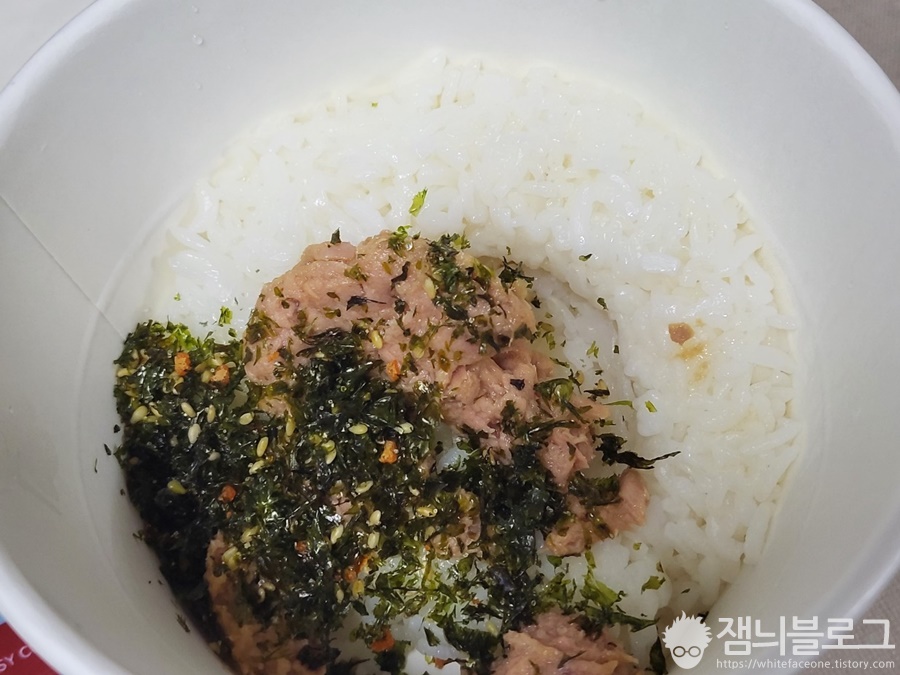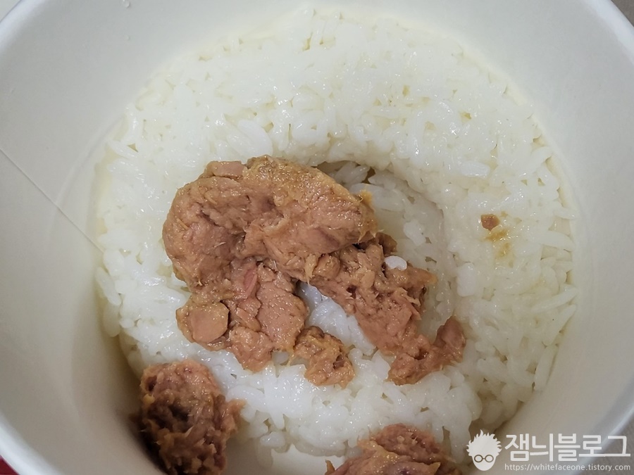 참치를 넣습니다. 생각보다 양이 그리 많지는 않으나 밥양도 많은 편이 아니라서 어떻게 보면 괜찮은 밸런스라고도 볼 수 있습니다.
