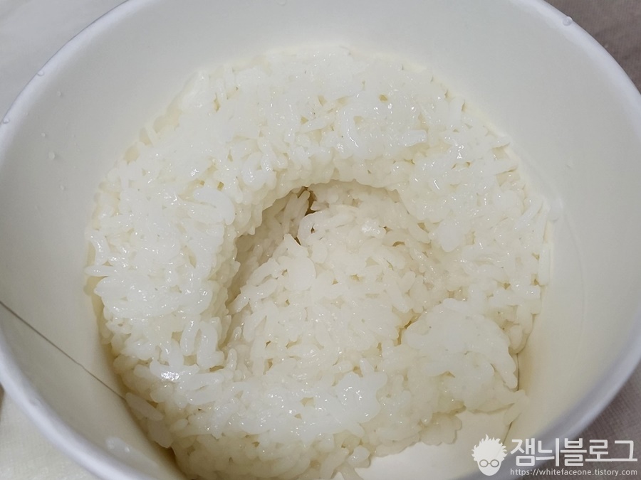 밥을 전자레인지에 넣고 2분을 돌렸습니다. 기호에 따라 시간을 조절하면 됩니다. 오래 돌리면 약간 꾸덕해지고 덜 돌리면 포슬해집니다.