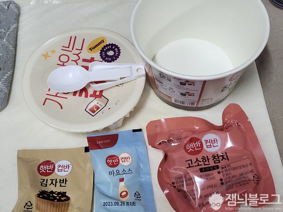 구성품은 용기, 햇반, 숟가락, 김자반, 마요소스, 참치입니다. 밥만 데워서 나머지 다 때려 넣고 야무지게 비벼 먹는 컵밥입니다.