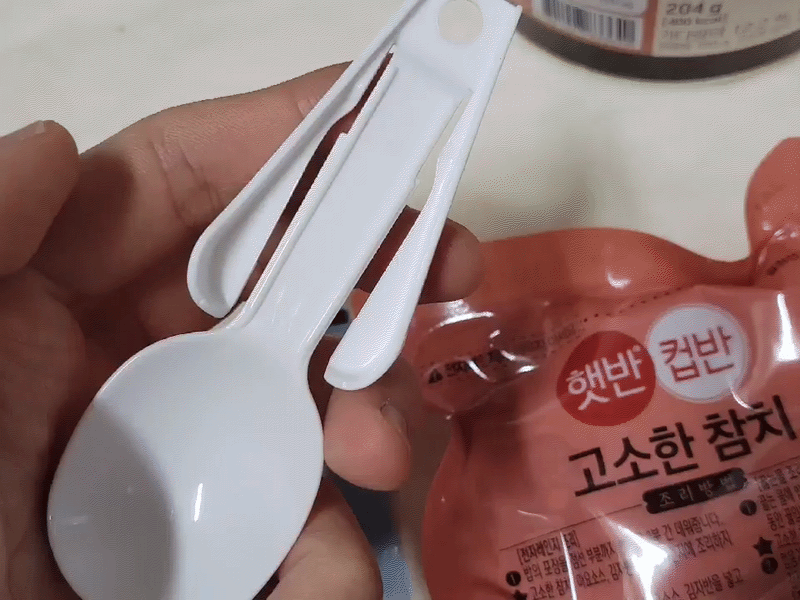 숟가락은 처음에는 짧지만 뒤집으면 길이가 2배로 길어지면서 성인 남성이 사용해도 괜찮은 길이감을 제공합니다. 꽤 튼튼해서 사용할 때 전혀 불편함이 없습니다.