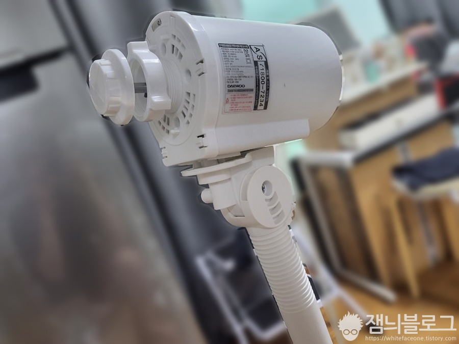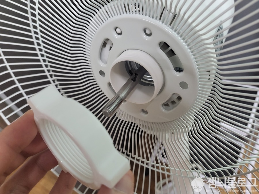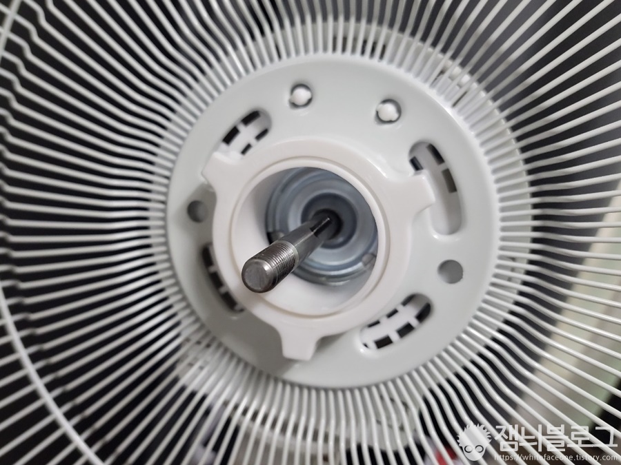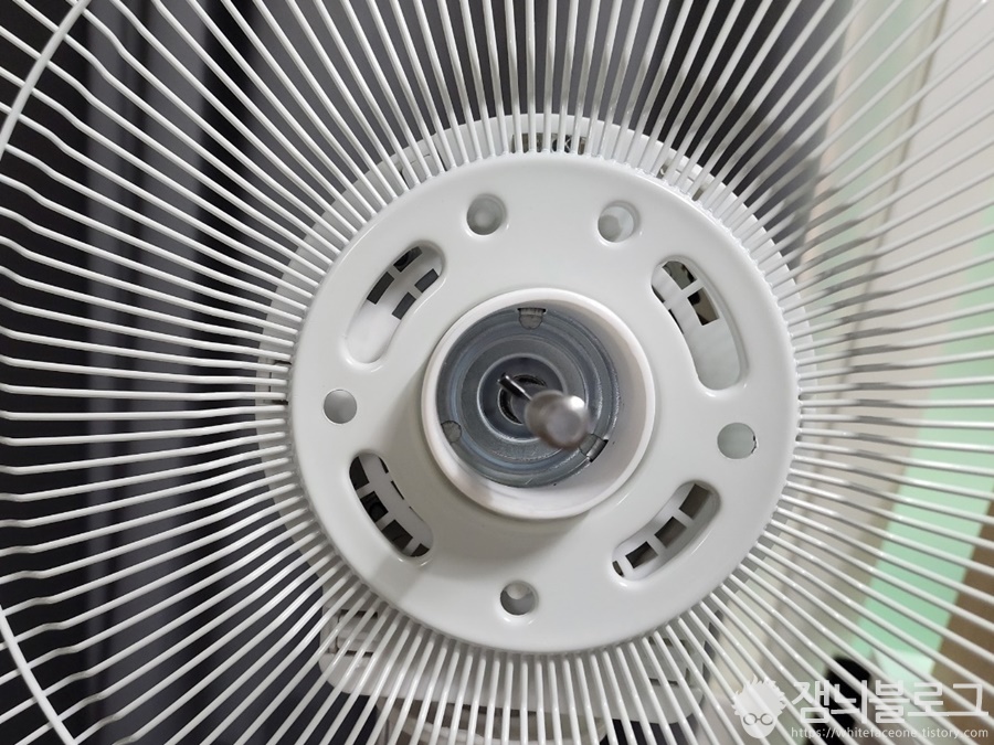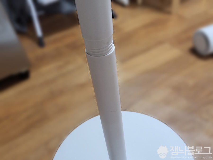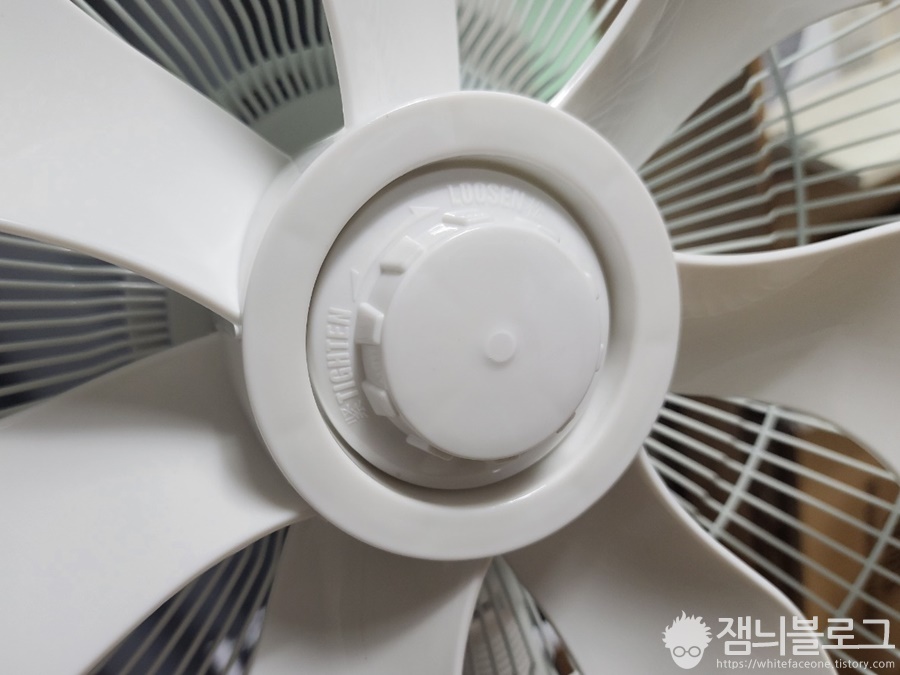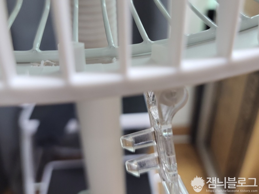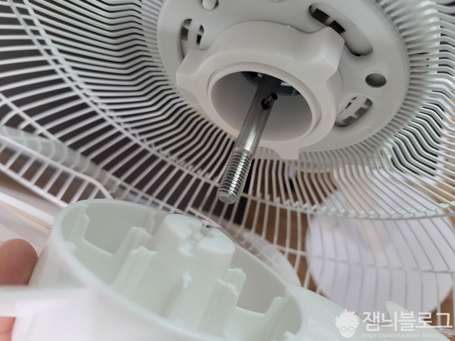 마지막으로 선풍기 헤드를 장착해 줍니다. 동일하게 돌려서 끼워주면 됩니다. 헤드 자체 무게가 있어서 플라스틱 기둥이 버틸까 싶지만 그래도 잘 고정됩니다.