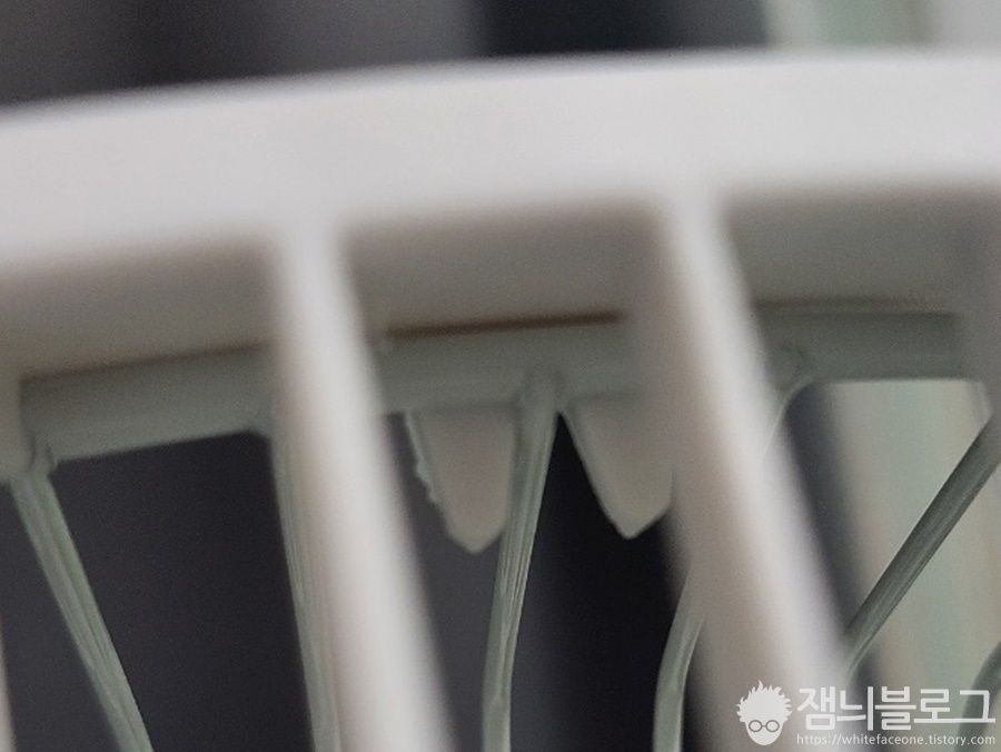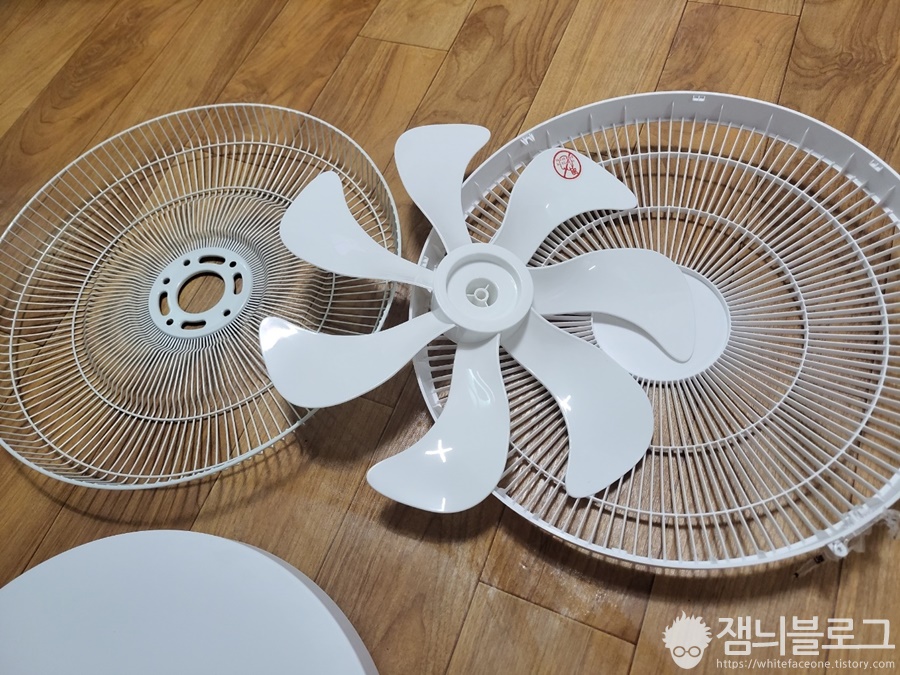 선풍기 헤드에 안전망과 날개를 끼워줄 차례입니다. 뒤쪽 안전망, 날개, 앞쪽 안정망 순으로 고정하면 됩니다. 날개 자체는 그냥 얇은 플라스틱으로 되어 있습니다.