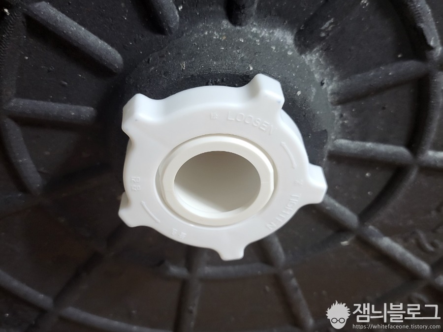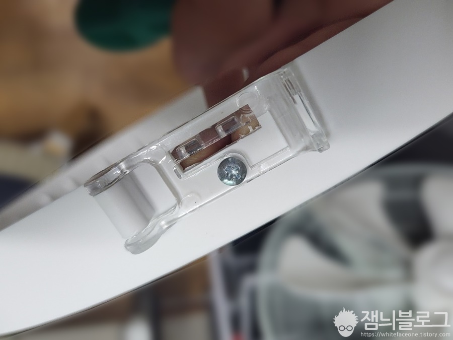 받침을 뒤집어보면 꽂아놓은 기둥이 튀어나와 있고 잠금장치를 이용하여 받침과 기둥을 고정해 줍니다. 다 플라스틱 재질이라서 너무 세게 조이면 균열이 생길 수 있으니 주의가 필요합니다.