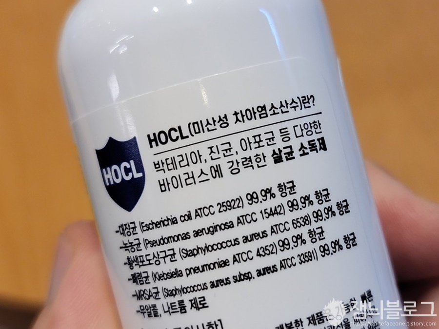 다이소에서 구매한 휴대용 소독제입니다. 알코올기반인 줄 알고 구매했는데 나중에 보니 더 강력한 미산성 치아염소산수가 들어있었습니다. HOCL 미산성 치아염소산수는 락스의 80~120배의 살균력이 있으며 염소가 잔류하지도 않는다고 합니다. 쉽게 말해 인체에 무해한 알코올과 락스보다 좋은 소독제입니다.
