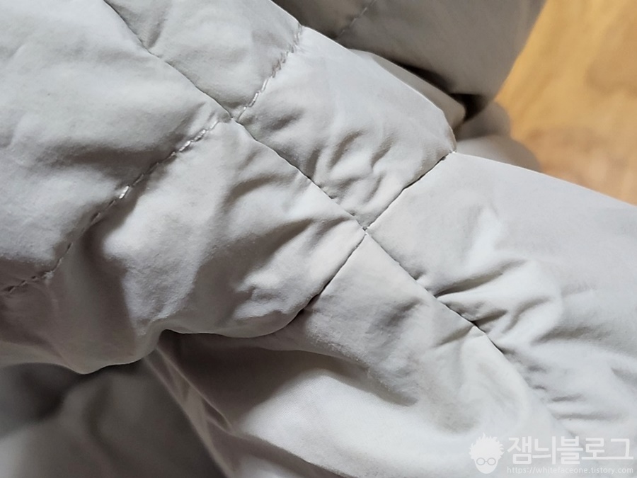 배송은 박스에 왔고 제품은 그냥 거대합니다. 비닐에 포장되었고 다크그레이 컬러와 고민하다가 스톤 컬러로 선택했습니다. 스톤 컬러는 그레이라기보다는 오묘한 무채색 계열 컬러감입니다. 확실히 겨울옷이라서 그런지 거대해서 방바닥에 그냥 늘어놓았습니다.