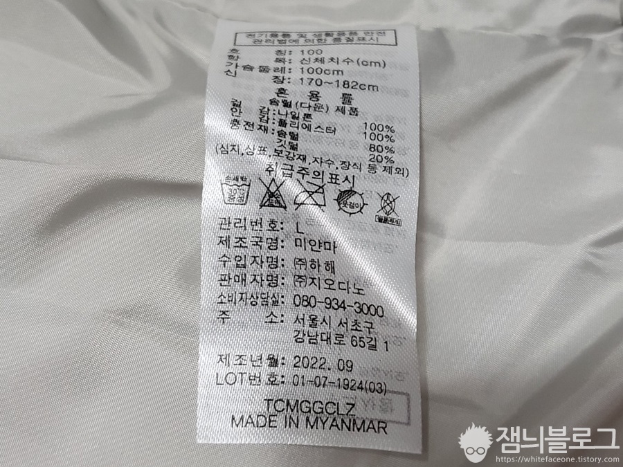옷 안 뒷목 쪽에 태그가 달려있고 옆구리 쪽에 실측태그가 달려있습니다. 재질은 나일론과 폴리이고 충전재는 오리털입니다. 손세탁만 가능합니다. 가슴둘레 100cm이고 권장 신장은 170~182cm입니다.