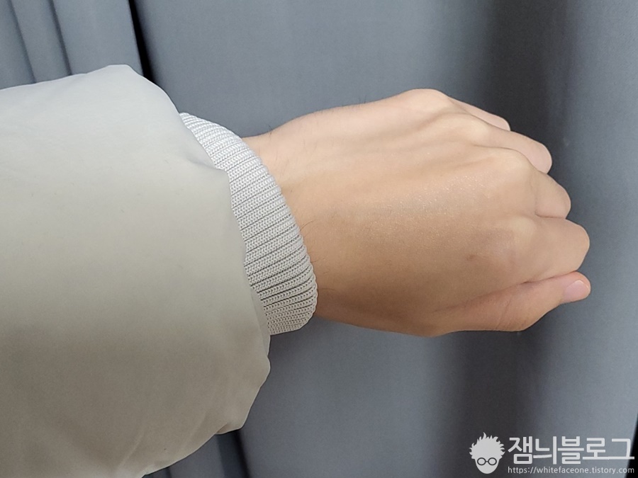 많은 숏패딩이 소매에 시보리(뜨개조르개) 처리되어 있지 않은데 이 제품은 처리가 되어 있어서 보온에 좀 더 신경 쓴 티가 납니다. 특별히 디자인적으로 어떤 효과가 있어 보이지는 않습니다. 손목을 감싸주는 쫀쫀한 맛이 있습니다.