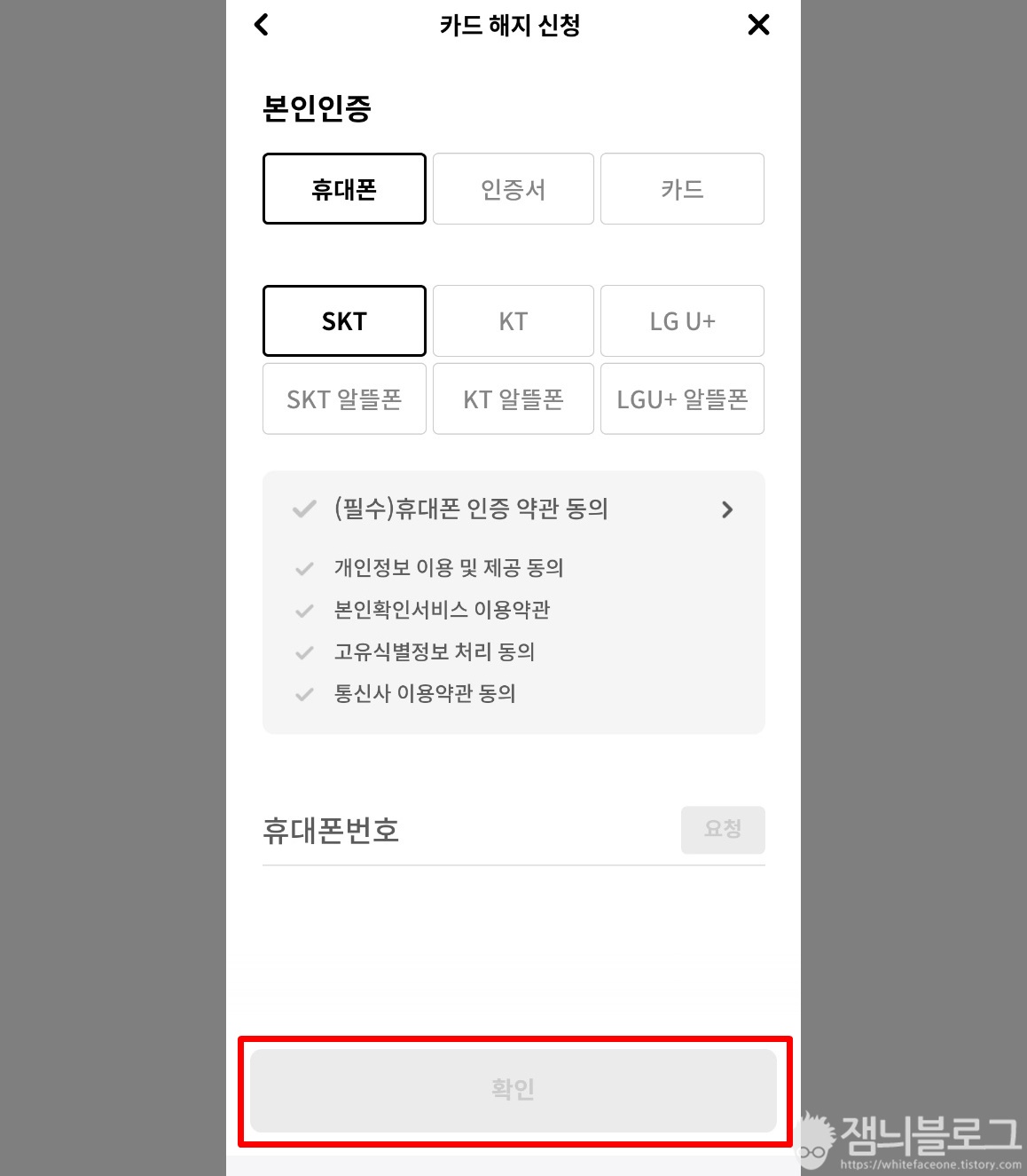 핸드폰 번호 입력 후 유의사항 체크 후 [해지 신청] 클릭, 휴대폰 인증 완료 후 [확인] 클릭