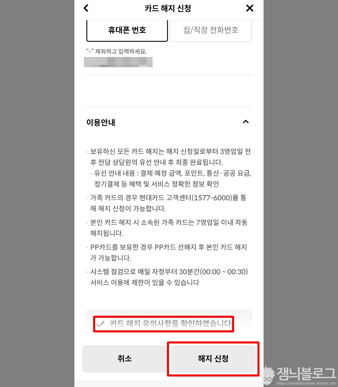 카드 해지 신청에서 유의사항 체크 후 [해지 신청] 클릭