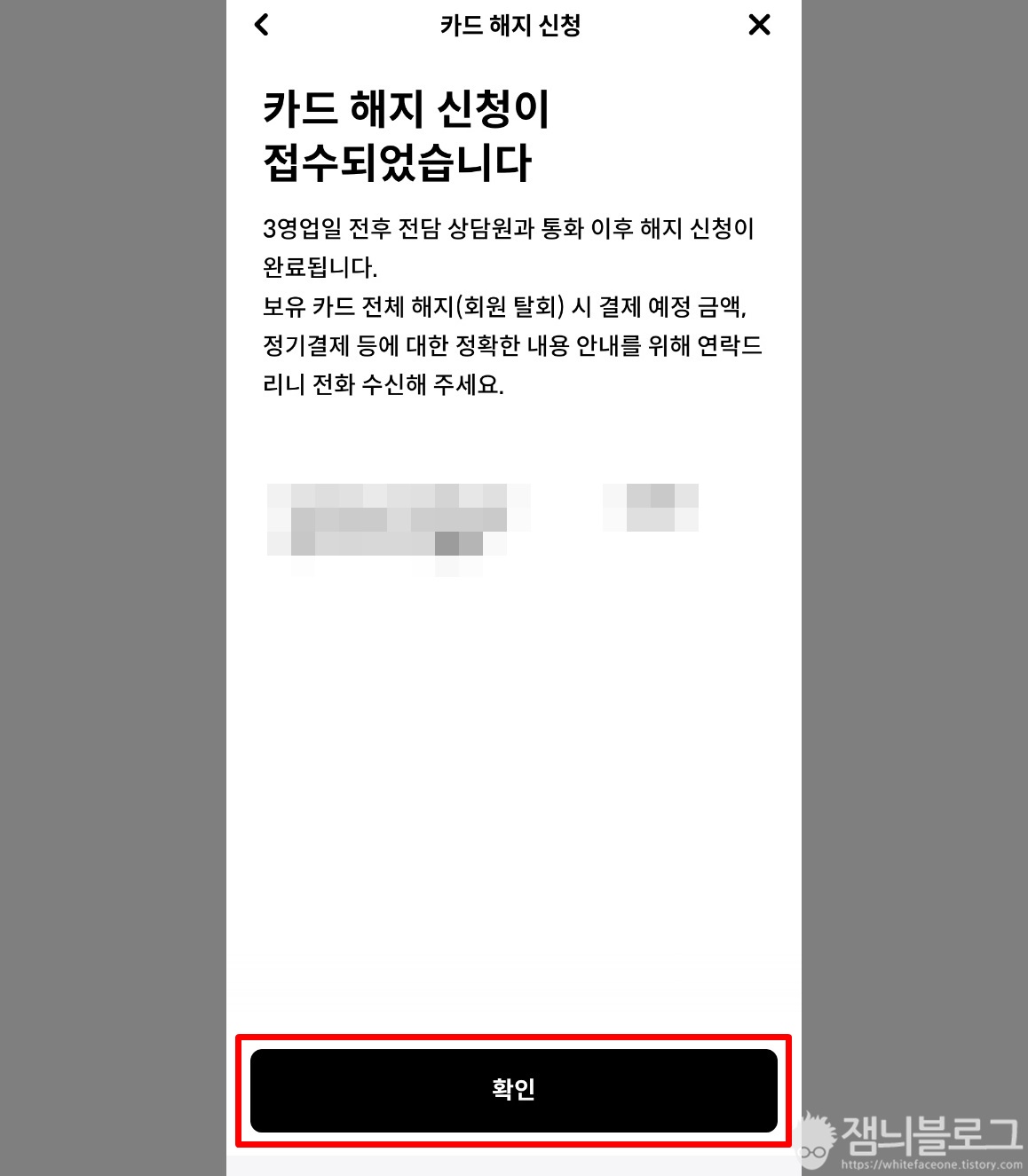 카드 해지 신청이 완료되었습니다. 3일 전후로 상담원 통화 후 해지 가능합니다.