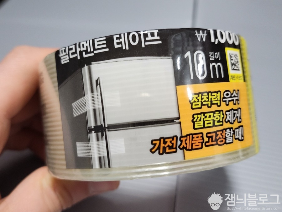 다이소 테이프 코너를 구경하다가 발견했습니다. 없는 게 없는 다이소입니다. 필라멘트 테이프는 가격이 1,000원입니다. 필라멘트 테이프는 테이프에 유리섬유로 심이 들아가 있어서 당겨도 늘어나지 않는 특징이 있습니다. 냉장고 처음 샀을 때 문짝에 붙어 있는 그 테이프 맞습니다.