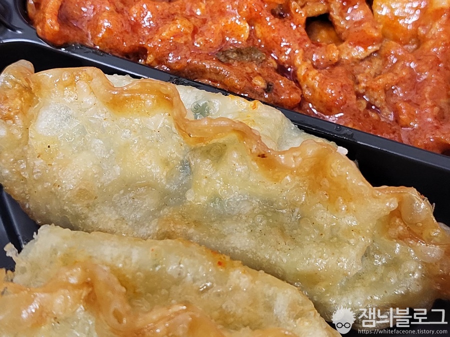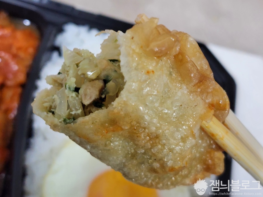 우리가 아는 편의점 도시락의 모습 그대로입니다. 투명한 뚜껑 안으로 보이는 재료를 보면 조합이 꽤 괜찮습니다. 특히 군만두는 호불호가 없기 때문에 거의 정답이라고 할 수 있습니다.
