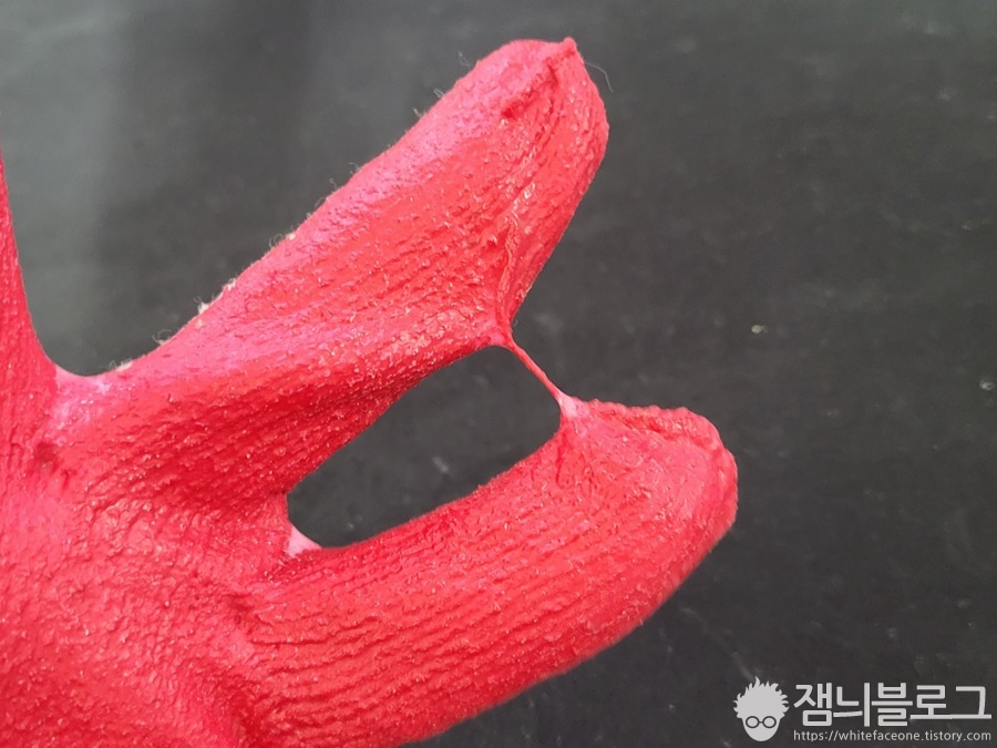 손가락 부분은 간혹 코팅 과정에서 실을 통해 옆 손가락과 이어지기도 하지만 그냥 뜯으면 자연스럽게 분리됩니다. 손목 부분은 짱짱한 고무줄이라기보다는 적당히 조여주는 정도의 탄성입니다.