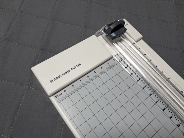 종이를 눌러 놓을 수 있게 뚜껑처럼 슬라이더를 들어 올릴 수 있습니다. 가운데 일자로 길이 나 있고 그 위로 칼날이 왔다 갔다 할 수 있도록 되어 있습니다.