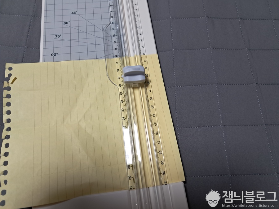 칼날 손잡이를 잡고 가볍게 눌러서 슬라이드 했습니다. 뭔가 종이가 잘리는 느낌도 없고 그냥 쓱 지나가는 느낌만 있습니다. 최대 10매까지 한 번에 처리 가능하다고는 하는데 5~6장 정도가 적정해 보입니다. 아마 9~10장 하면 힘도 들도 종이가 잘리는 게 아니라 밀리거나 찢어질 것 같다는 생각입니다.