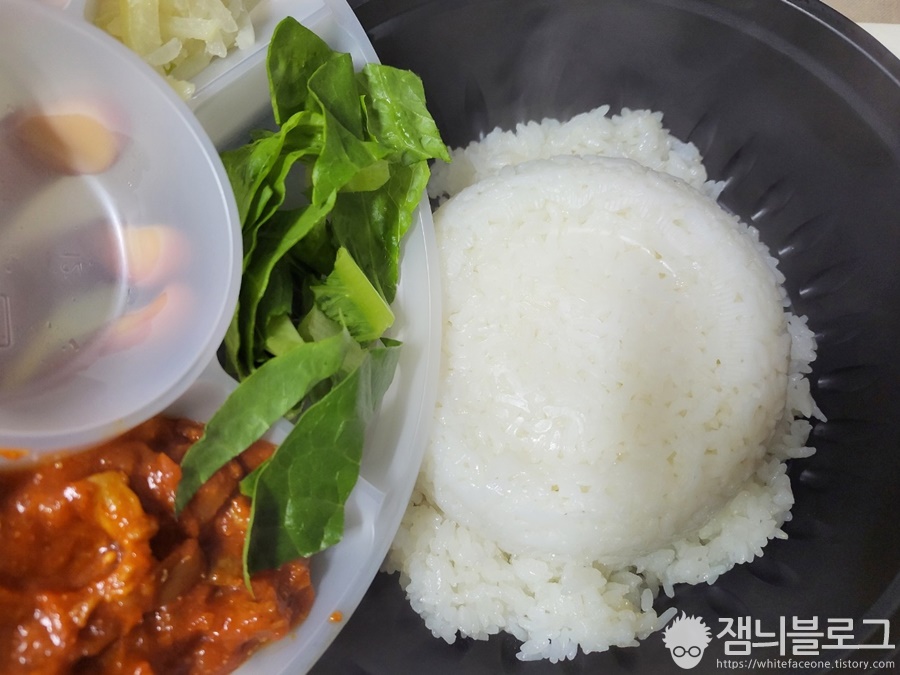 아 갑자기 배고픔이 극에 달해서 햇반을 추가해서 넣었습니다. 가뜩이나 곱빼기였는데 햇반까지 추가하는 건 제대로 배 터지겠다는 건데 과식은 금물입니다. 재료는 뚜껑을 확 뒤집어서 살살 치면 알아서 떨어집니다.